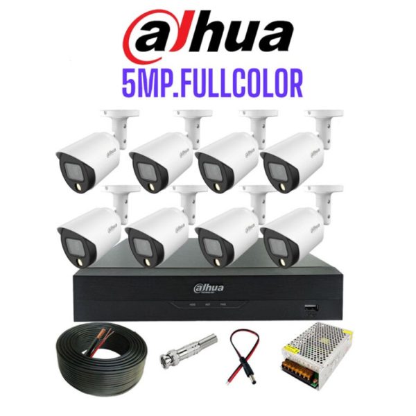 پک کامل دوربین مداربسته 5 مگاپیکسل داهوا با دید در شب رنگی فول کالر تا 40 متر در تاریکی مطلق مناسب مکان های متوسط و بزرگ میباشد.این پک کامل شامل 8 عدد دوربین مداربسته داهوا 5 مگاپیکسل فول کالر و دستگاه ضبط کننده 8 کانال 4K داهوا / کابل تصویر و برق /منبع تغذیه/فیش برق و bnc میباشد.هم چنین دارای نرم افزار رایگان انتقال تصاویر برروی گوشی موبایل و تبلت و… نیز میباشد.